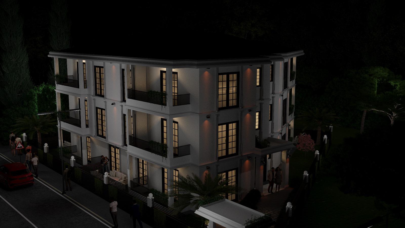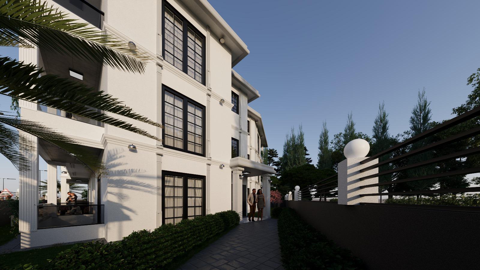 Giriş kapısı ve site sınırları özel mimariyle tasarlanmış, peyzajda modern çizgiler korunmuştur. İçerideki daireler fonksiyonel yerleşimi, modern detayları ve geniş yaşam alanlarıyla dikkat çeker.